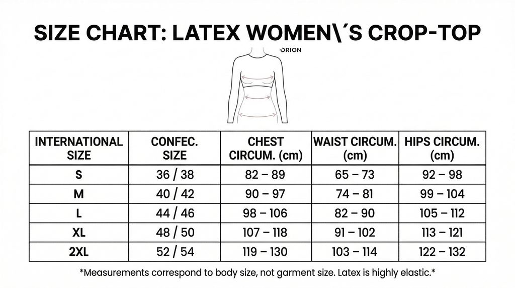 Kezelési tanácsok: Mint minden latex ruházatnál, a felvételhez speciális öltöztető segédanyagot (lubrikánst) vagy hintőport (talkumot) ajánlunk. Tárolja száraz, sötét helyen, közvetlen napfénytől védve.