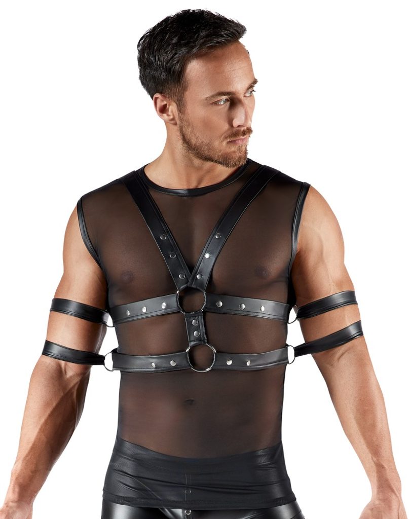 Ujjatlan ing, hám és 4 csukló-/kézbilincs egy fekete szettben a Svenjoyment BONDAGE-tól. Az ing elöl lágy, áttetsző powernet anyagból készült, hátul pedig matt megjelenésű. Az ing egyes részei matt megjelenésű szegéllyel rendelkeznek. Az ing puha és rugalmas, ami rendkívül kényelmes viseletet biztosít. A hám állítható matt megjelenésű pántokkal (patentokkal) rendelkezik. A mellkason és a hasi pántokon gyűrűk találhatók, amelyekhez a mellékelt bilincsek rögzíthetők. A puha bilincsek gyorsan felhelyezhetők és könnyen állíthatók a tépőzáras záródásnak köszönhetően.
