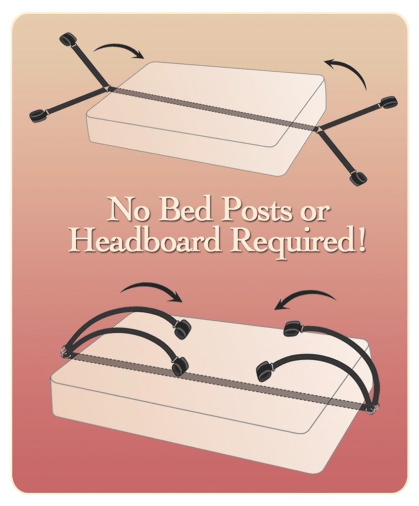 Készlet bilincsekkel, amelyek az ágy matraca alá helyezhetők. Nincs szükség ágykeretre vagy oszlopokra. Anyaga textil, színe fekete.