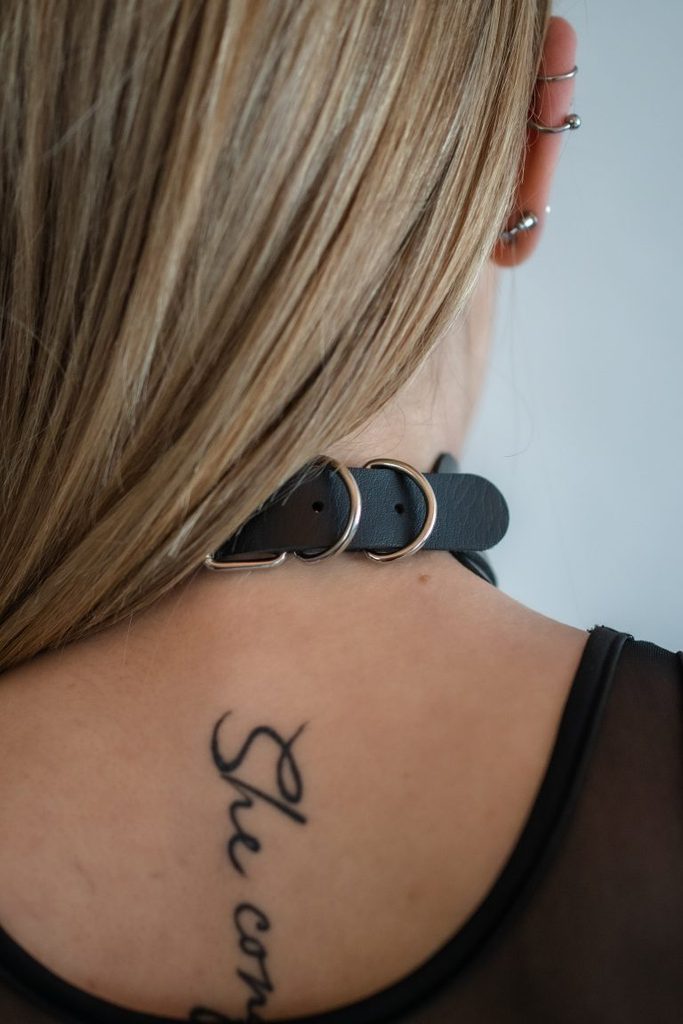 Fekete nyakörv láncokkal, szexi kézhevederrel kiegészítve.