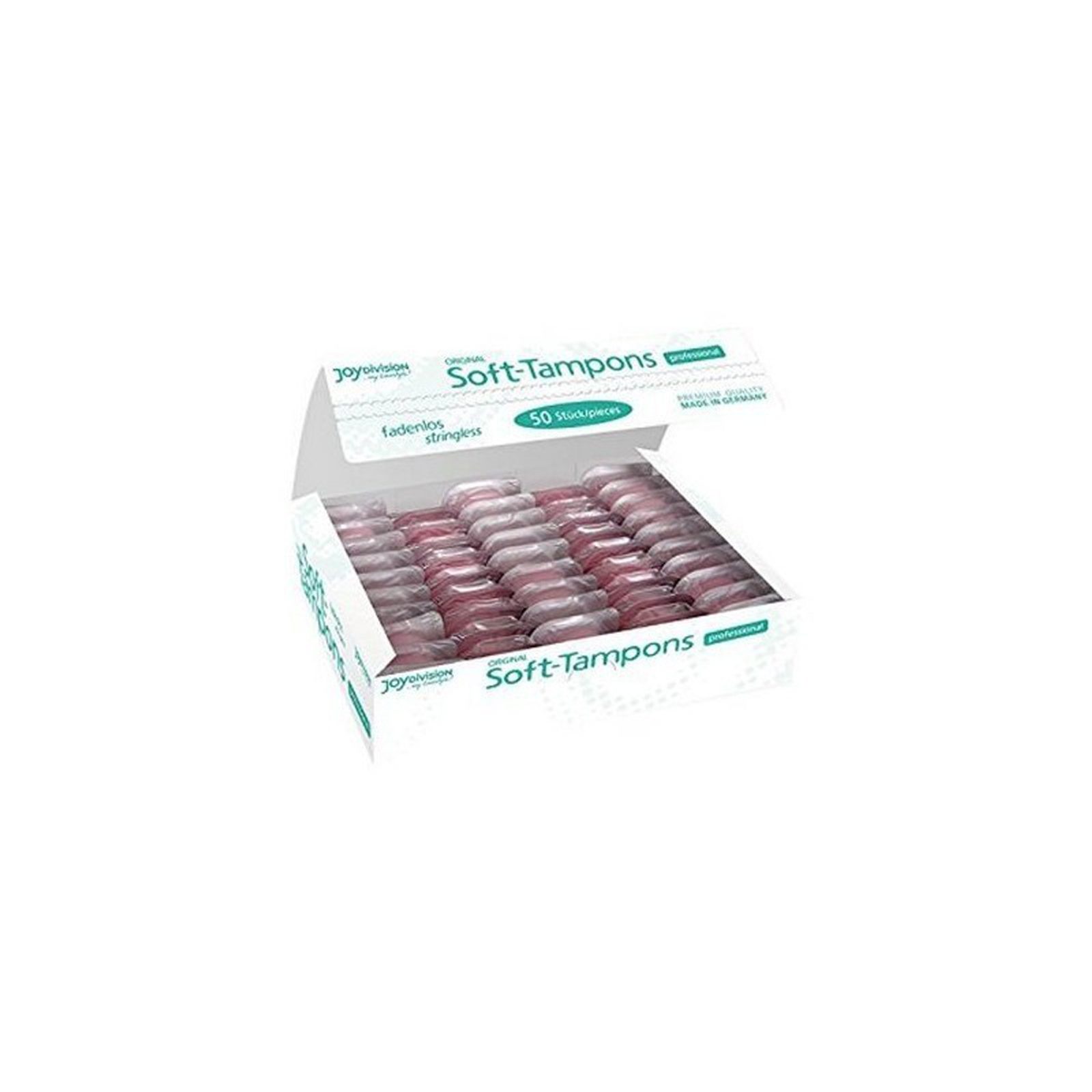 Soft Tampons Professional a Joydivision német vállalattól egyszerűen használható és úgy tervezték, hogy szinte észrevehetetlen legyen szeretkezés közben. A tamponok zsinór nélküliek, ergonomikus formájuknak köszönhetően minden anatómiához alkalmazkodnak. Kényelmesek és kellemes viseletet biztosítanak. Puha és rugalmas anyagból készülnek, és egy tampon súlya mindössze 2 gramm.
