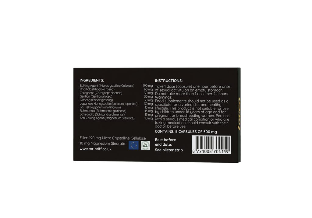 A tabletták összetétele: • Rhodiola: Növeli az energiát, a sportteljesítményt és a szexuális funkciókat • Cordyceps: Támogatja a szív egészségét • Schisandra: Javítja a szexuális állóképességet és a fizikai kondíciót • Japán lonc: Egyensúlyba hozza a testet (Jin és Jang) és energiát ad a vérnek • Tárnics: Támogatja a jobb vérkeringést • Ginzeng: Növeli az energiát, javítja a szexuális teljesítményt és befolyásolja a vérnyomást • Eucommia kéreg: Erősíti az ízületeket • Fo-Ti: Támogatja a máj és a vesék megfelelő működését • Cassia: Erősíti az immunrendszert • Rhemania: Javítja a veseműködést és a csontsűrűséget • Scrophularia: Tisztítja a májat és növeli az életerőt