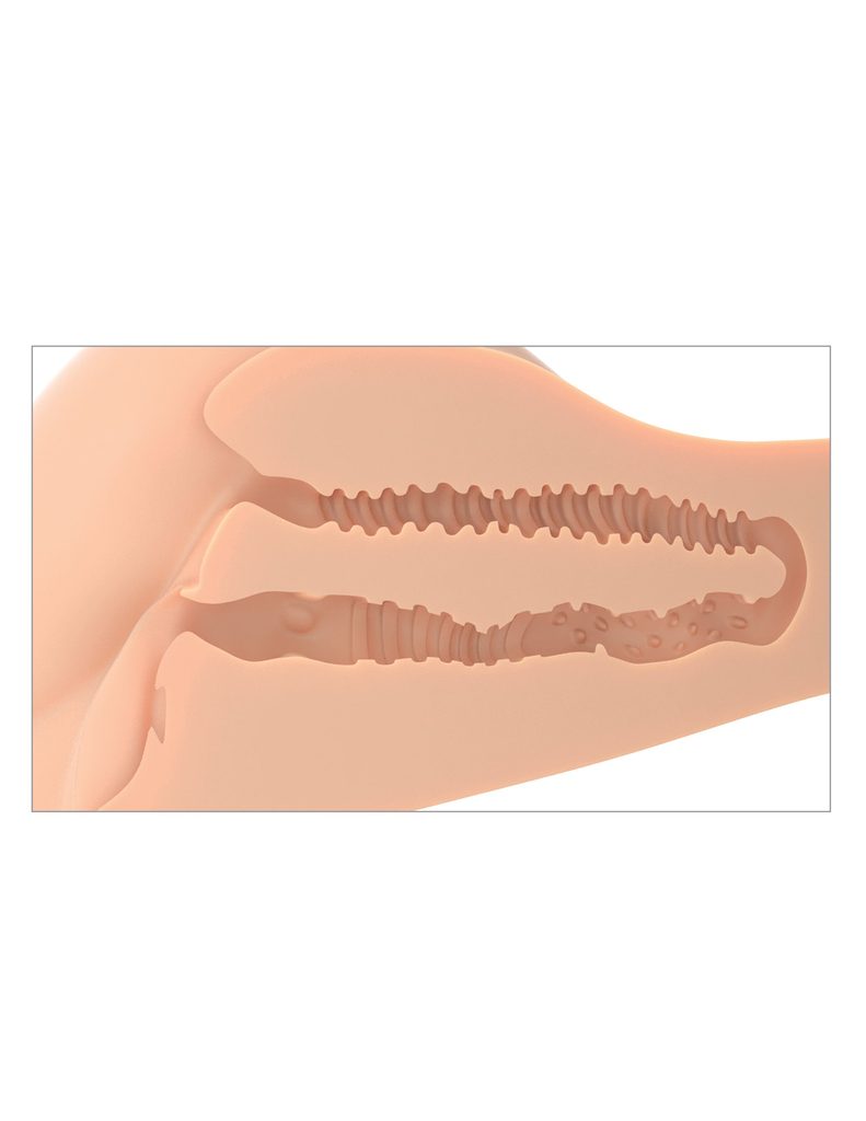 Két örömcsatorna: Hüvely és anális nyílás szoros, de rugalmas alagutakkal, amelyek intenzív stimulációt nyújtanak a gondosan megtervezett belső textúrájuk révén.