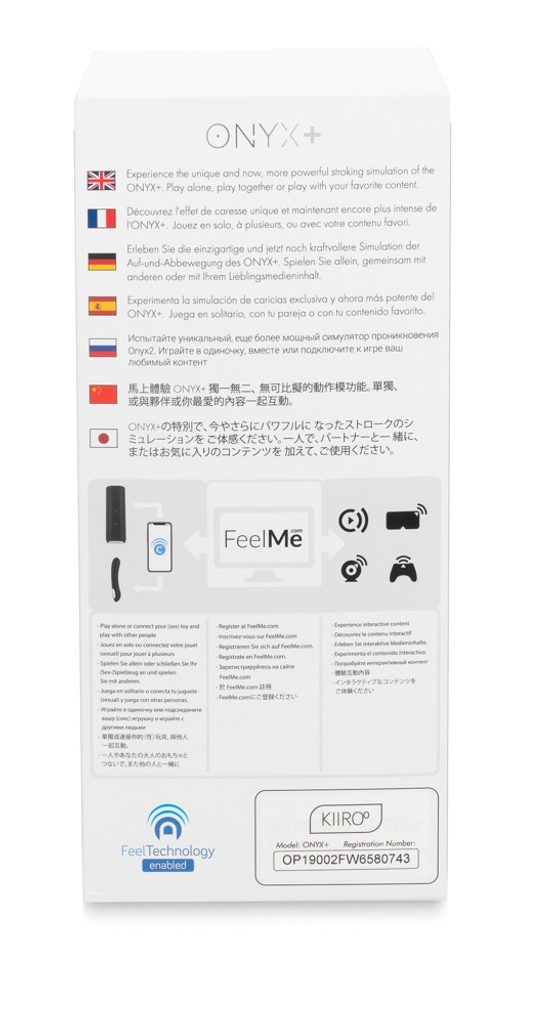 Teljesen automatikus masturbátor bőrhatású textúrájú, pöttyözött hüvellyel. A 10 összehúzódó gyűrű belül nagyon intenzív stimulációt nyújt. Az ONYX+ Bluetooth vagy WiFi kapcsolaton keresztül kompatibilis partnerjátékszerekhez csatlakoztatható a valósághű távolsági szex érdekében. A szabadalmaztatott teledildonikus szenzorok a partner mozgásait továbbítják a masturbátorhoz. Az integrált szoftver lehetővé teszi a FeelMe.com weboldal használatát, amely szinkronizálja a masturbátort kódolt videókkal, játékokkal és webkamerákkal. Interaktív módban az ütés hosszát és sebességét maga a masturbátor irányítja – igazodva a partner játékához vagy az online tartalomhoz. Az ONYX+ manuális módban is használható, ahol az ütés sebessége egyedileg állítható. USB-kábelt tartalmaz.