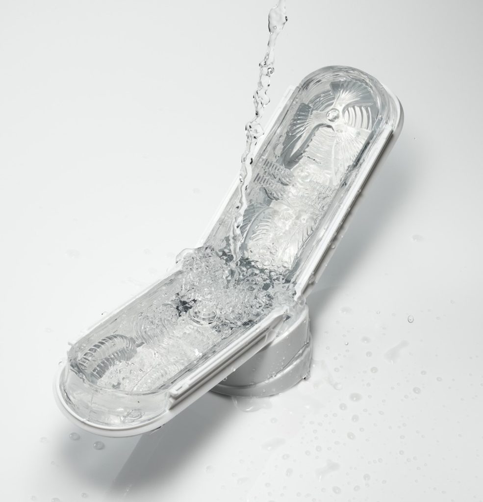A maszturbátor kinyitható, így könnyen feltölthető kenőanyaggal és tisztítható – a beépített szárítóállványnak köszönhetően pedig higiénikusan szárítható.
