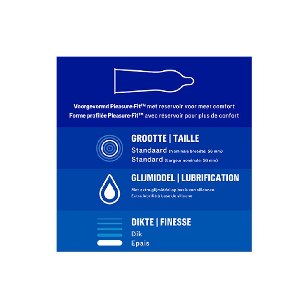 A Durex Extra Safe óvszerek maximális védelmet nyújtanak szex közben. Kissé vastagabb latexből készülnek, és szilikon alapú síkosítóval vannak bevonva. Az Extra Safe óvszerek nagyobb biztonságérzetet kínálnak anélkül, hogy lemondanál az élvezetről, mindezt előnyös kiszerelésben.