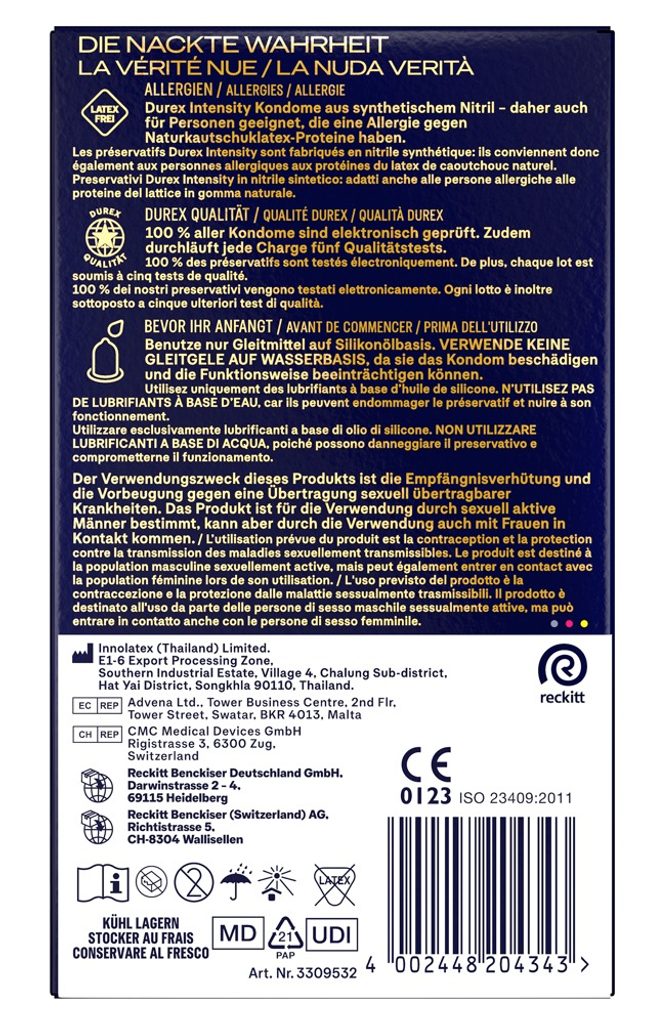 A Durex Intensity rendkívül vékony, átlátszó óvszerek, melyek nitrilből készülnek, így intenzív testhő átvitelt biztosítanak, és természetes érzetet nyújtanak, mintha semmi sem lenne közöttetek. Bőséges szilikon alapú síkosítóval vannak bevonva, ami biztosítja a sima használatot.