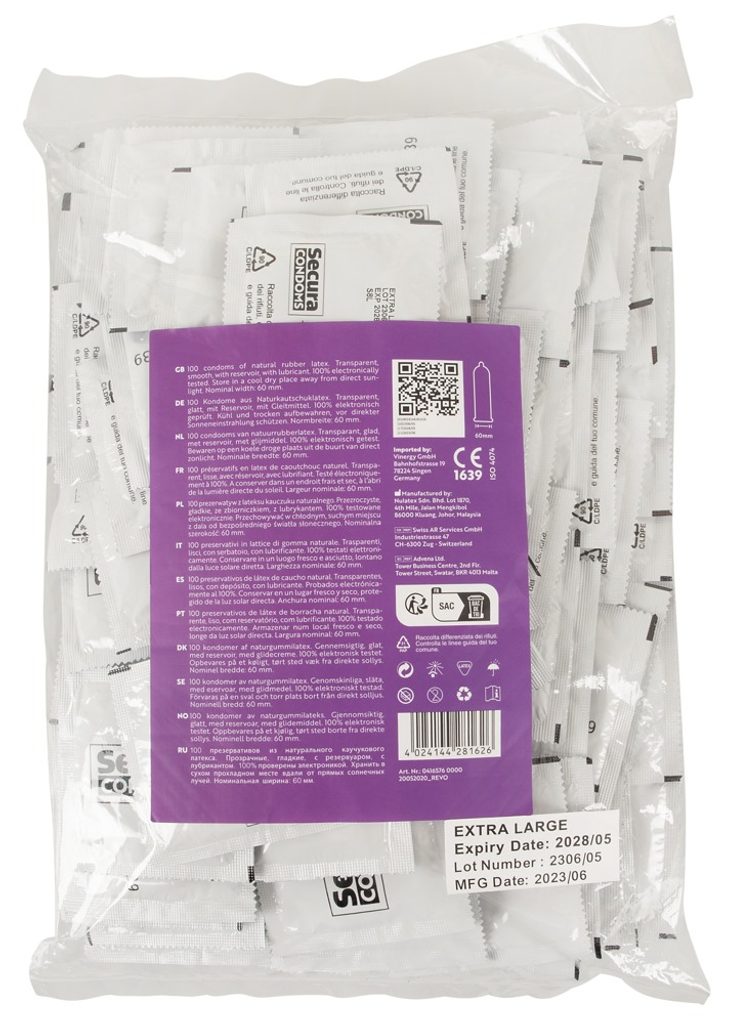 Áttetsző, extra nagy méretű Secura Extra Large óvszerek a Secura Condoms márkától. Szilikon alapú bevonattal. Vegánok számára is alkalmas. Szagtalan és íztelen.