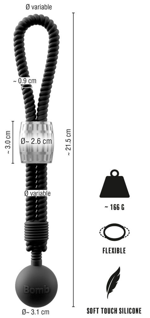 A Rebel márka Heavy Rope Cock Strap with Ball nevű strapabíró fekete pántja egyedi kötélmintás kialakítással, csúszó fém súllyal és golyó alakú kiegészítő súllyal rendelkezik (összsúly: 166 g). Rugalmas kivitelének köszönhetően könnyen alkalmazkodik a péniszhez, javítva a vérkeringést és erősebb erekciót biztosítva. A pánt kényelmesen felhelyezhető a herék köré, vagy akár mindkettőre egyszerre. A kiegészítő súly mozgás közben leng, intenzív stimulációt nyújtva. Ez a „nehézsúlyú” eszköz új dimenziót hoz az intim játékokba!