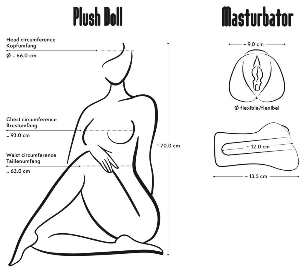 A csomag tartalmaz egy különálló, élethű vagina megjelenésű maszturbátort, amely puha, bőrbarát tapintású anyagból készült. A maszturbátor egyszerűen behelyezhető a baba lágyékrészébe – a hozzáférést diszkrét cipzár biztosítja a baba hátán. Az állítható zsinór segítségével stabilan és biztonságosan rögzíthető.