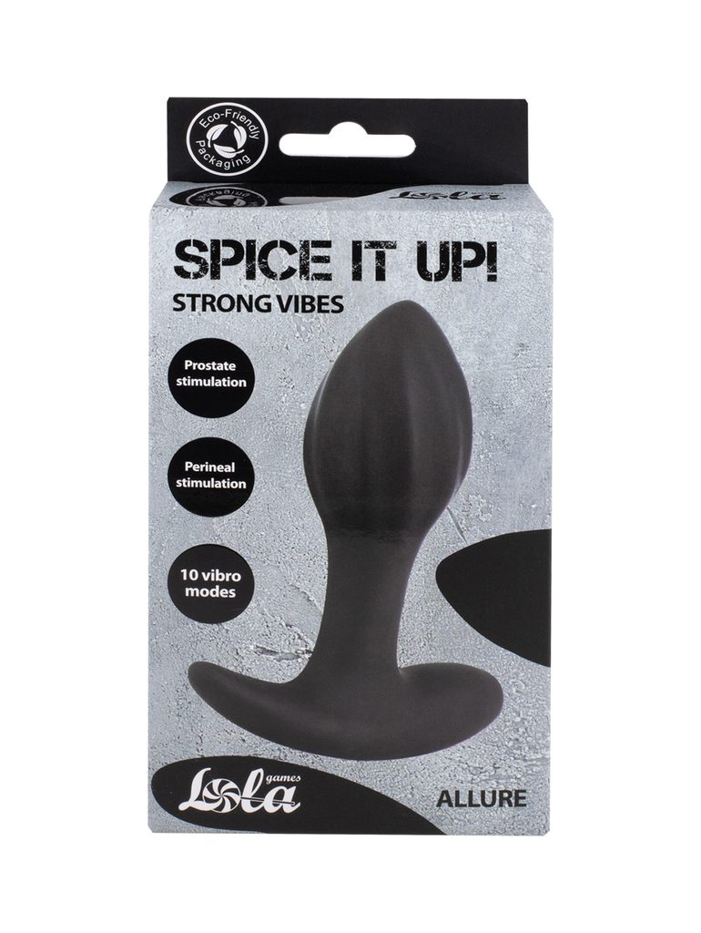 A Spice it Up Allure egy tölthető anális plug, amely puha orvosi szilikonból készült, és két erőteljes motorral rendelkezik – egy a penetrációs részben, egy pedig az alapban, hogy belső és külső stimulációt biztosítson. Mindkét motor 10 különböző rezgési üzemmódot kínál, amelyek egyidejűleg működnek. A penetrációs rész rugalmas szára lehetővé teszi, hogy az Allure vibrációs alapját az egyéni igényekhez igazítsa. A plug vízálló az IPX6 szabvány szerint, és USB-kábellel tölthető (a csomag tartalmazza). Az optimális élmény érdekében szilikon alapú síkosító használata javasolt. Működési idő – 60 perc. Töltési idő – 120 perc.