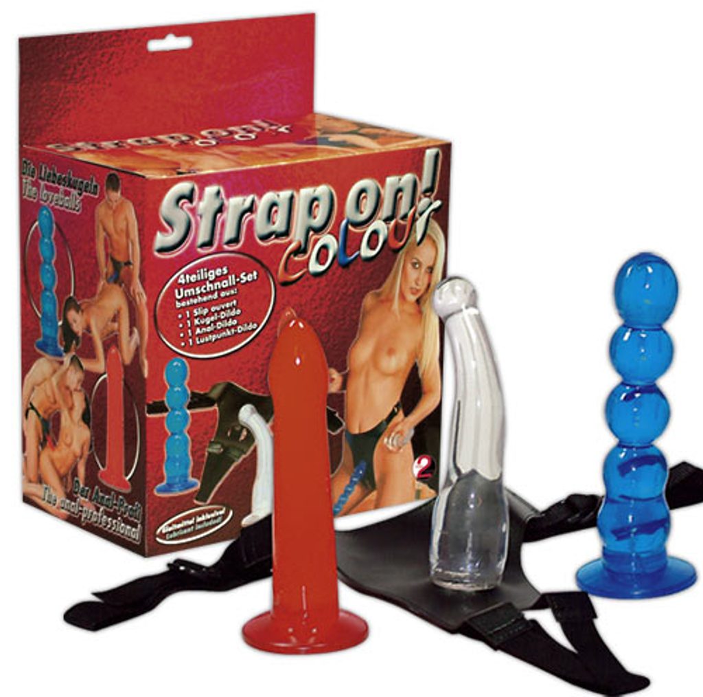 Szett hámmal és három különböző dildóval, zselés anyagból. Simított piros dildó kerek fejjel (19 cm, átmérő 3 cm), kék dildó gyöngyös kialakítással (20 cm, átmérő 2.5 - 4 cm), valamint ívelt dildó G-pont stimulátorral (19 cm, átmérő 2 - 4.5 cm).