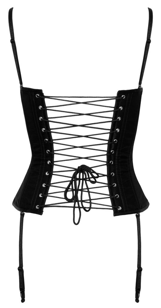 A mellkast fedő fűző a Cottelli PARTY márkától finom, matt szaténból készült. Az oldalt bevarrt (7-7 db) formázó merevítők biztosítják a kényelmes viseletet és a gyönyörű sziluettet. Az elülső cipzár lehetővé teszi a gyors fel- és levételt. Hátul a fémrudakkal megerősített fűzőrész anyaggal van bélelve, így a bőr nem marad fedetlen. Az állítható pántok és harisnyatartók teljesen levehetők.
