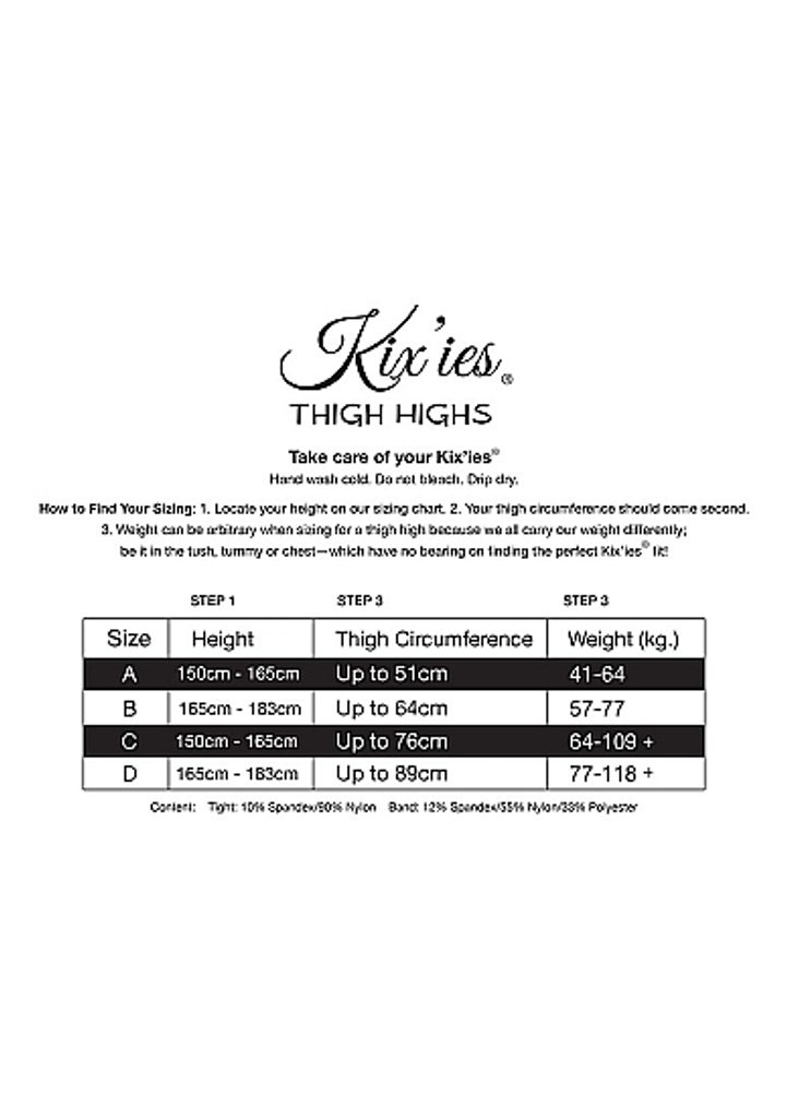 Méret: Először mérje meg a magasságot, majd a comb kerületét. A testsúly nem számít a combfix méretezésénél. Mindannyian máshogy hordjuk a súlyunkat; legyen az a has, a derék vagy a combok területén – ez nem befolyásolja a tökéletes Kix'ies ® illeszkedés megtalálását! Itt az ideje, hogy kidobja a megkötős harisnyanadrágokat és az elavult harisnyákat!