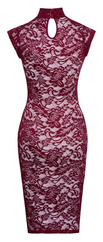 Ez a testhezálló, térdig érő ruha mély borvörös árnyalatú, dekoratív csipkéből készült, amely luxus és időtálló hatást kelt. A rugalmas anyag szépen alkalmazkodik az alakhoz, és kiemeli annak természetes íveit.