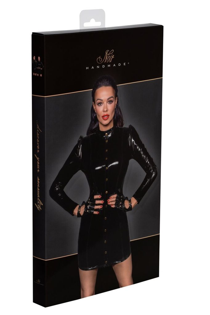 Rövid PVC ruha a Noir Handmade márkától, puffos vállal és hosszú ujjakkal. Elöl a gallértól az alsó szegélyig arany kapcsokkal záródik. Elegáns és divatos megjelenés, amely tökéletes minden partira. Elérhető méretek: S, M, L és XL.