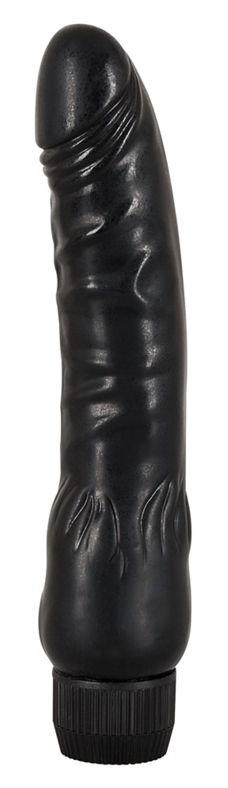 Fekete, nagyon népszerű vibrátor kifejezett erezettel és makk kialakítással. Könnyű gél anyagból készült. A vibráció egyszerűen szabályozható egy gyűrűs vezérlővel, amely egyben az elemek helye is.