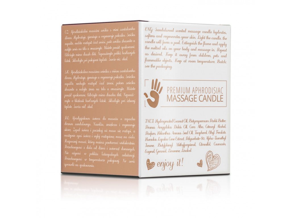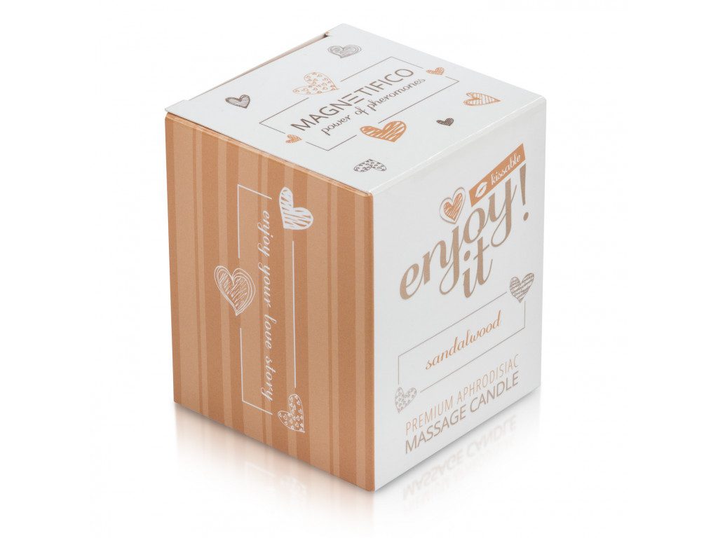 A masszázsgyertya a teljes test masszírozására szolgál. Speciális keveréket tartalmaz, amely shea vajból, kókuszolajból, méhviaszból, antioxidánsokból és egyéb összetevőkből áll. A gyertya meggyújtása után néhány perc alatt felolvad masszázsemulzióvá, amelyet a partner testére önthet, és egy felejthetetlen masszázsban részesítheti. A MAGNETIFICO Enjoy it! masszázsgyertya prémium összetétele hidratálja, táplálja és regenerálja a bőrt, így az puha tapintású marad, míg az érzéki illat fokozza a közösen eltöltött pillanatok élményét.